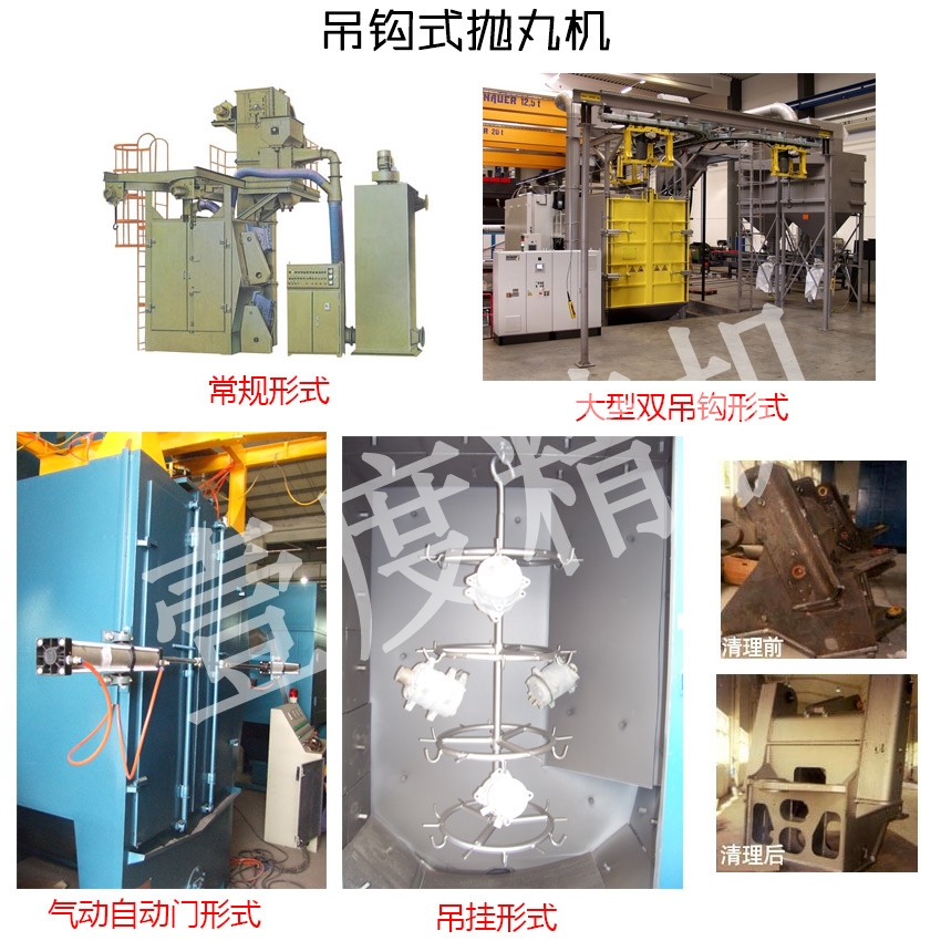 注:本機(jī)適用鋼砂、鋼丸或鋅丸等金屬磨料,拋丸器可變頻調(diào)速,吊具可設(shè)計(jì)成固定在機(jī)艙內(nèi),也可以設(shè)計(jì)成自動進(jìn)出形式,工件自轉(zhuǎn)速度可變頻調(diào)整,門可自動開啟也可以做成手動開啟,裝卸工件處可加裝安全光幕,讓操作更安全可靠,也可根據(jù)需要定制其它輔助使用裝置。以上機(jī)型為我公司標(biāo)準(zhǔn)化設(shè)計(jì),如果客戶需要其他形式,可根據(jù)客戶工件大小及工藝需求規(guī)劃設(shè)計(jì),隨時(shí)歡迎來電咨詢,我們將竭誠為您服務(wù)。